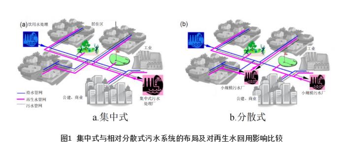 ①集中建設大規模污水處理系統具有較大的系統風險性,適度分散的污水處理系統不但提升了整個城市的排水系統總體韌性與可靠性,同時也有利于高品質再生水作為城市第二水源的就地短距離回用,也減少了污水收集管網多次提升及截污干管的工程量,避免了再生水遠距離泵送導致的巨量投資及運行的高能耗。集中式與相對分散式污水系統的布局及對再生水回用影響比較見圖1。