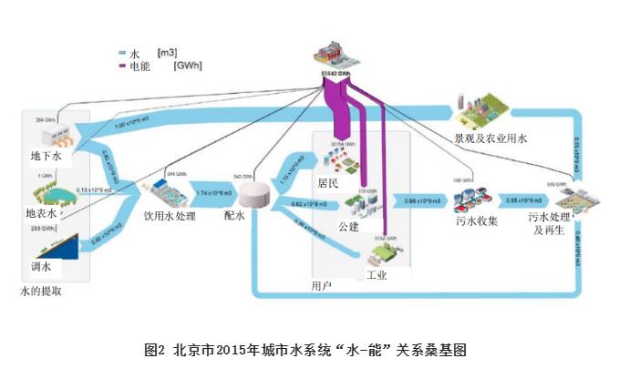 圖2所示給出了北京2015年水系統水量與能耗分配關系桑基圖,可以評估城市“水足跡”過程及能量消耗,在城市尺度上系統評估和多目標優化“水-能”關系,通過水系統全流程過程系統規劃、聚焦水循環每個鏈條,進行傳統工藝改進、高效設備及革新性工藝技術應用,尤其是對排水系統結構優化進而提升系統能源利用效率,因地制宜地采用污水中資源、能量回收以及清潔能源提取和利用等技術措施,進一步降低水系統能耗和溫室氣體排放,對于提升水系統韌性及可持續至關重要。