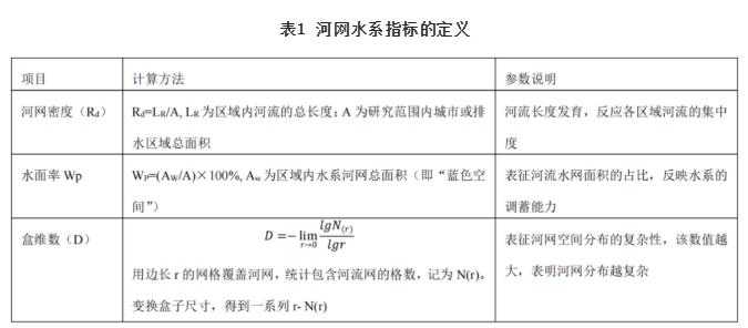 河網調蓄能力是水系在水文方面的重要功能之一,尤其在削減洪峰、降低洪水危害中具有重要的作用。受人類活動影響,尤其是近半個世紀年以來快速城鎮化引起的土地利用方式變化,致使許多城區河流、水塘、水淀區被掩埋甚至完全消失,導致城市水面率大幅減少,河網、水系發育及演變也表現出由復雜到簡單、由多元到單一的變化趨勢。世界范圍內60%以上的河流受到城市化的影響,而城市化對河流生態完整性及生態功能造成了嚴重威脅;從國內外經驗看,這種演變無疑還會加劇洪澇災害、水質惡化等問題。借助河道容蓄指標與水系結構參數的相關關系分析河網結構對調蓄能力的影響,常用的水系變化指標包括數量特征參數和復雜性參數,選取河網密度(Rd)、水面率(WP)描述水系的數量特征,河網盒維數描述水系的復雜性特征,各指標計算方法及內涵見表1。