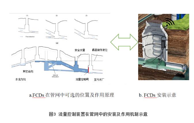 國外的研究和實際案例表明,基于整個排水系統的拓撲結構,結合管網水力模擬等手段,選擇在管網關鍵節點處設置流量控制設備,通過布局策略、具體安裝數量和位置優化,可以實現雨季對管網在線調蓄能力的充分利用,并實時減少CSO及下游管網的流量壓力,見圖3。我國室外排水設計標準缺少在城鎮排水管網適當位置設置流量控制調節設施、設備等方面的具體技術要求或建議,因此,實際項目設計往往沒有考慮對排水系統流量主動控制與優化分配的必要性,導致暴雨期間無法實現對整個排水管網不同位置或區域的下泄流量和流速的有效控制,以及短時下游管網承受來自上游管網超量的流量沖擊進而使得下游排水區域的排水不暢、內澇及CSO等現象,甚至在管網薄弱環節出現突發性的滿溢和洪澇災害;同時,由于管網中缺乏FCDs,不能充分發揮管網應有的在線調蓄能力,對末端流量控制易造成瞬時沖擊和壓力。實際上,分布式的流量控制設備相對大規模灰色基礎設施建設更加經濟、易于實施、可持續,因此,改進傳統排水管網被動接收的排水模式,通過設置必要的在線流量控制裝置實現排水系統峰值流量管控,向“空間”換“時間”的主動控制方向轉變,對于增加汛期排洪防澇的靈活性、提升排水系統韌性和可靠性等方面至關重要。