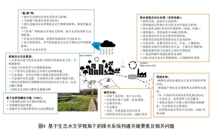 傳統城市排水系統的規劃、設計與實施環節可歸結為“水量”和“水質”兩個維度,缺乏跨學科性且統籌不足,因此在規劃設計中融入生態水文措施可以彌補傳統排水設施的剛性缺欠。近年來,在“海綿城市”理念引領下,一些基于自然的解決方案(Nature-based solutions ,NBS) 得到應用。盡管NBS是為特定目的而設計的(如城市排水),但它可以同時提供多種生態系統服務,如雨水自然處理和滲濾、蒸發和生物多樣性保持等。通過對近些年的一些實踐案例調研發現,個別具有“生態”特征的綠色基礎設施項目,從“現代生態水文學”角度來評價,則會發現其在城市水文、生物多樣性及水生態服務等維度上缺乏系統性統籌,因此,應從排水系統或者全域水資源系統管理角度,充分考慮水的社會循環擾動對自然水文及生物多樣性的影響。城市級流域尺度上水系統不同要素之間的關聯及相互作用關系見圖4。