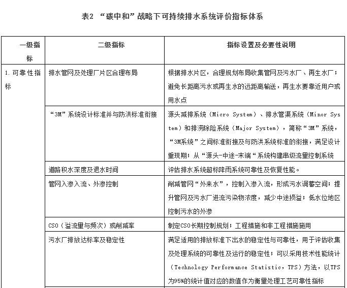 基于上述分析,“碳中和”格局下隨著氣候變化影響下不確定性天氣日益增加,水系統作為市政基礎設施要成為韌性城市總體規劃的重要組成部分,也要主動適應不斷變化的外在環境壓力及相關條件的約束而不斷調整和優化框架、技術和管理體系;從另一角度看,低碳既是水系統面臨的壓力,更是給水務和環境行業帶來了新的技術發展驅動力、商業模式創新和發展機遇。水務行業要系統性構建以韌性、可靠性與可持續性為基本特征的面向未來的城鎮排水系統框架,至關重要的問題是,可持續城市排水系統構建需要跨學科、跨部門的協作和共同實踐,問題在于所涉及的社會和技術復雜性,以及對水系統面臨的綜合挑戰和系統解決方案的范圍缺乏共同的理解和認知,推進可持續排水系統的構建不是一件容易的事情。目前,國內外尚缺乏“碳中和”戰略下可持續排水系統評價指標體系,為此將系統可靠性、韌性、低碳、生態安全性、智慧監測與控制及非工程性措施與利益相關方的積極參與六個維度設置為一級指標,在一級指標基礎上細化為47項二級指標,具體見表2。需要說明的是,不同指標之間可能會存在一些內在的邏輯關系和相互影響,但是排水系統本身就是一個多維度、多層次、多因素、多目標復雜交織的體系,需要各個專業的共同協作和推進。