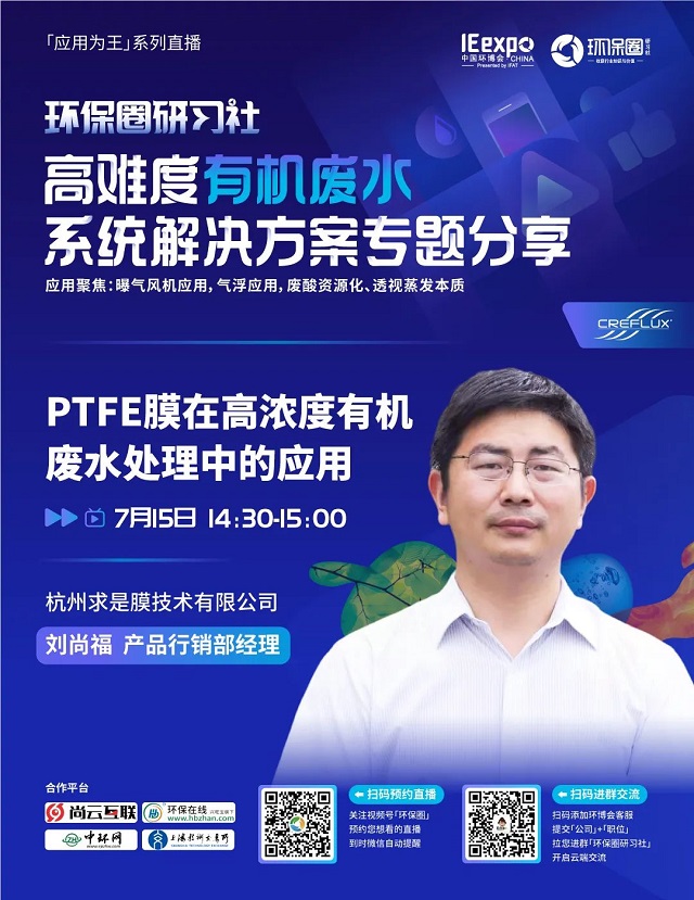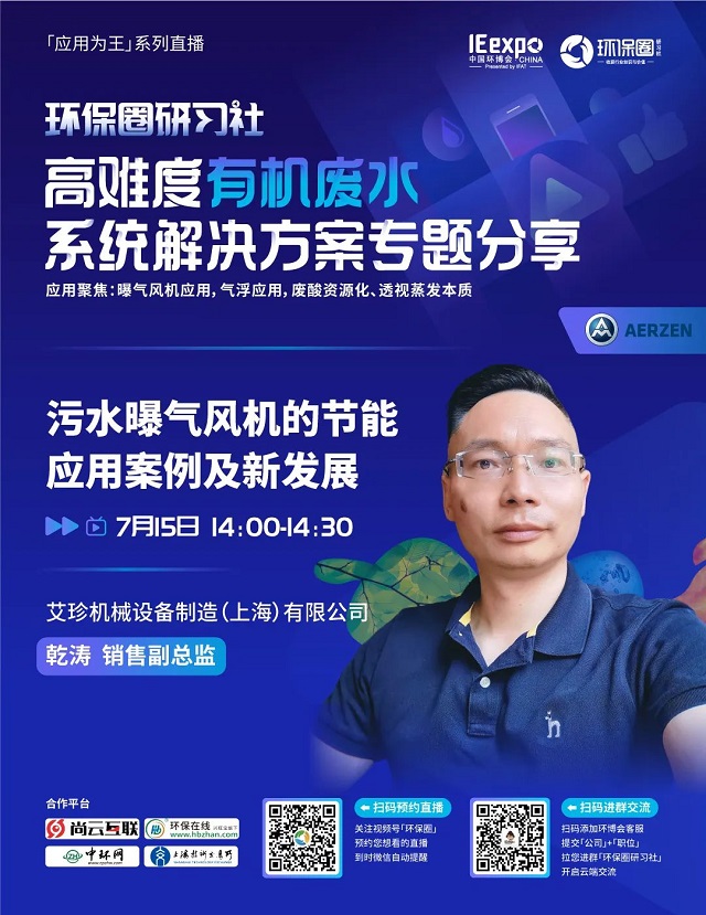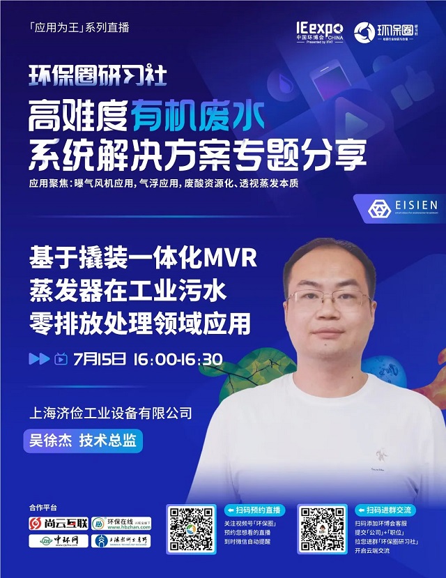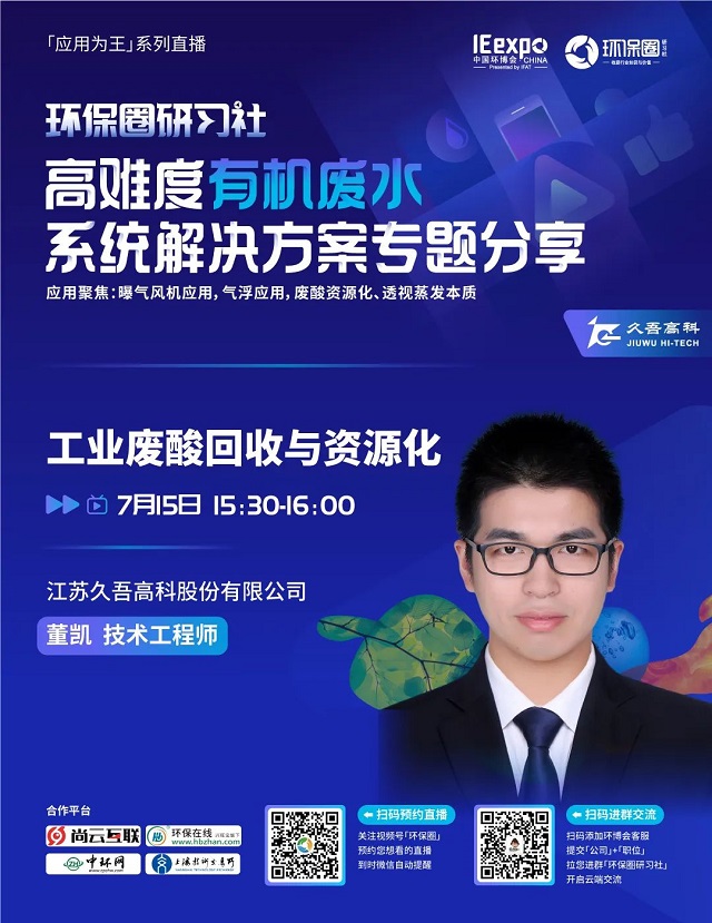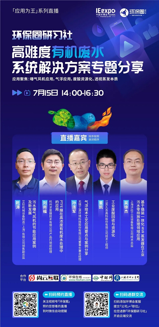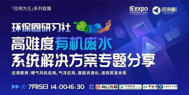 7月15日(星期五)下午14:00-16:30,環保圈研習社“應用為王”系列直播高難度有機廢水系統解決方案專題分享,有幸邀請到了艾珍機械、求是膜、工源環境、久吾高科、上海濟儉5家企業的技術專家做客直播間,與我們共同探討“水環境”污染處理問題,并為大家帶來高難度有機廢水的節能處理、資源化利用、零排放處理等相關技術及解決方案分享。