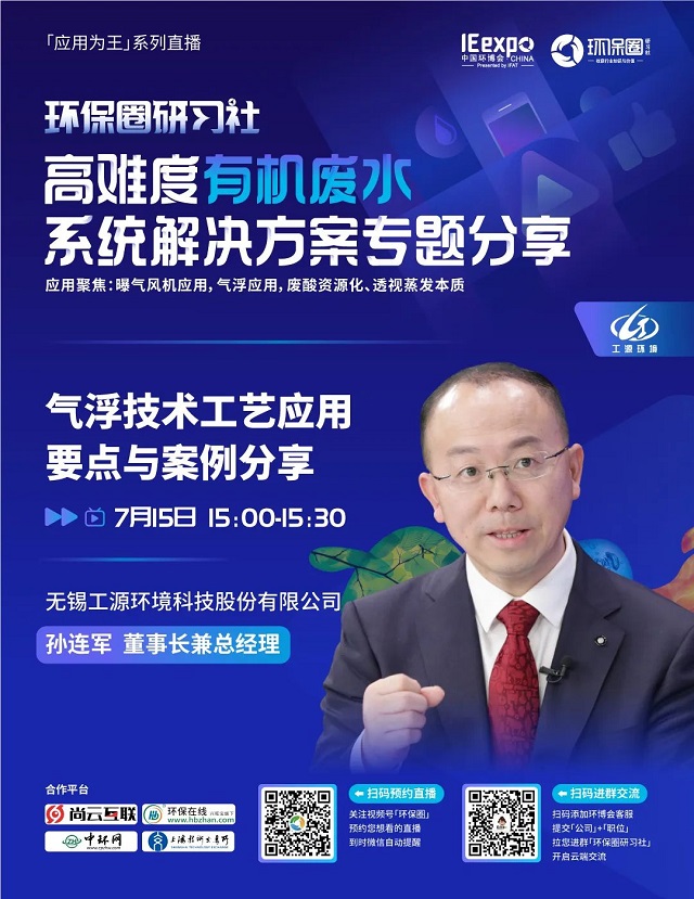 本場直播由工源環境董事長兼總經理孫連軍先生——擁有近30年環保行業從業經驗的環保人,親自為您講解氣浮技術工藝應用要點,并帶來大量現場應用實例展示,如果您的項目有提標除磷、河湖水體除藻治理、高濃廢水(廚余垃圾、屠宰、養殖、垃圾滲濾液、化工廢水等)這些困擾,更不能錯過本場直播!