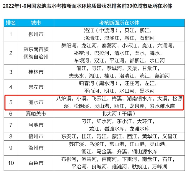 在今年上半年水環境質量前10名的榜單中,浙江省麗水市排名第5。前5月,168個重點城市空氣質量排名中,麗水位列第8。