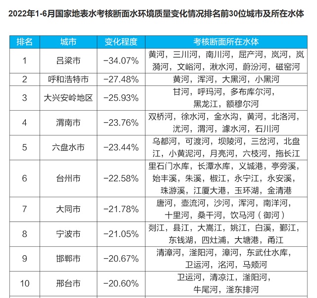 不僅是呂梁,記者在榜單里看到,山西大同也在水質進步上“喜提”上榜,在上半年位列全國第七。