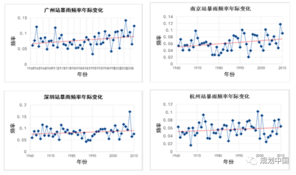 分析全國主要城市60年來的氣象數據發現,隨著溫度升高,短歷時強降雨天氣增加,大多數城市暴雨都更多了,這是一個趨勢,增加了城市洪澇災害的風險。