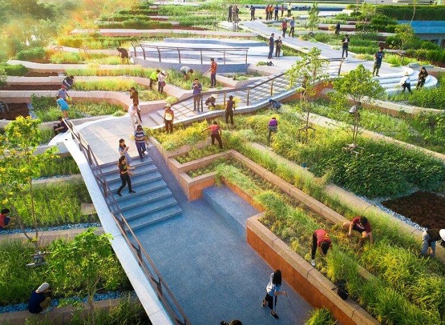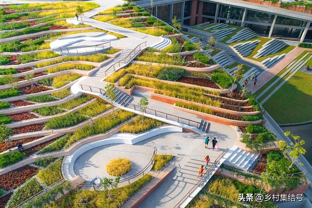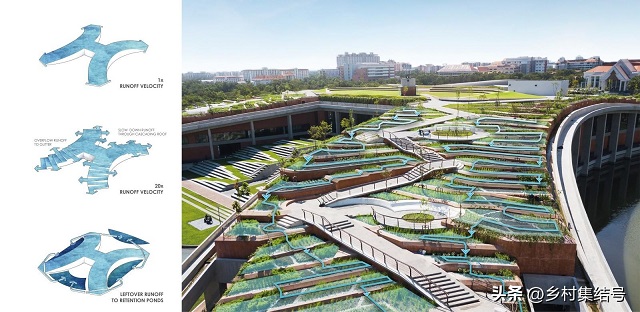 當雨水擊中屋頂時,首先農作物的種植加強了土壤的肥沃度,減少了雨水期間的水土流失,并有效防止污染徑流和空氣中的毒素從排水系統和自然水體中進入。多余的雨水會沿著斜坡蜿蜒而下,下一層梯田就會收集上一層的徑流,所到之處會形成獨特的小分水嶺群,幫助吸收、過濾和凈化雨水。