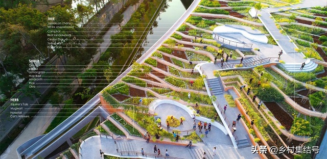 在景觀設計中,設計師試圖讓垂直建筑與食物來源產生重合,于是在受到了東南亞山區的傳統農業實踐的獨創性啟發后,農場采用了傳統水稻梯田的形式,結構采用古老的夯土技術建造,并將其土方工程與現代綠色屋頂技術相結合,實現了現代景觀與傳統農業的創意發展。相比傳統的混凝土屋頂,經過層疊設計的梯田屋頂更能有效減緩多達20倍的雨水徑流。