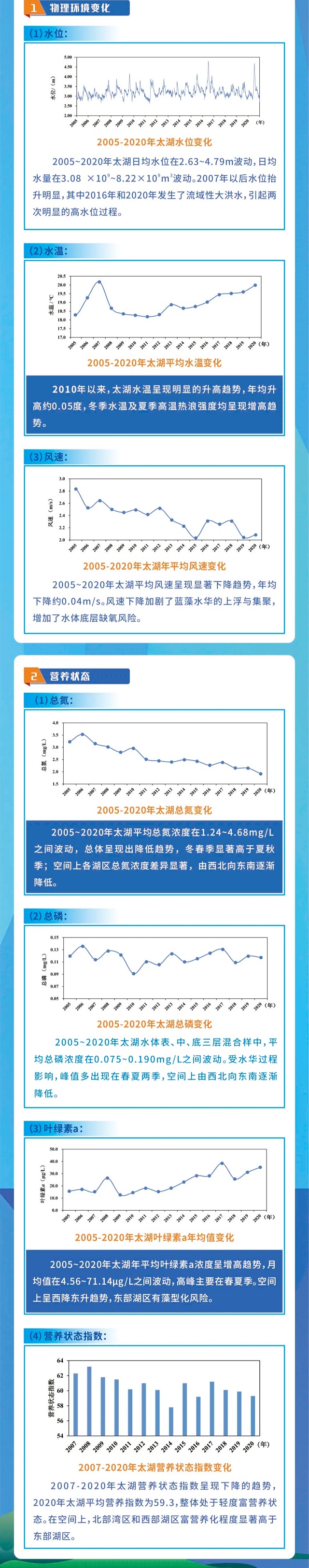 湖泊就像人一樣,也需要良好的營養狀態。2005——2020年,太湖平均總氮濃度在1.24——4.68mg/L之間波動,總體呈現出降低趨勢,冬春季顯著高于夏秋季。空間上各湖區總氮濃度差異顯著,由西北向東南逐漸降低2005——2020年太湖水體表、中、底三層混合樣中,平均總磷濃度在0.075——0.190mg/L之間波動。受水華過程影響,峰值多出現在春夏兩季,空間上由西北向東南逐漸降低;2005-2020年太湖葉綠素a年均值變化上,年平均葉綠素a濃度呈增高趨勢,月均值在4.56——71.14μg/L之間波動,高峰主要在春夏季。空間上呈西降東升趨勢,東部湖區有藻型化風險。