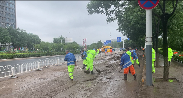 現場,北京環衛集團的相關人員正抓緊對這些淤積泥沙進行清理。在公路上,大型鏟車、多功能作業利用車前的刮板,把淤泥鏟起并堆積起來,再用大型清運車輛拉走后進行沖洗作業。而在人行道上,工作人員主要通過人工作業,利用鐵鍬等工具將路面清理干凈。