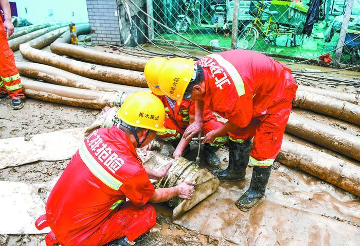 搶險(xiǎn)人員正在安裝排水管。 本報(bào)記者孫宇楓攝