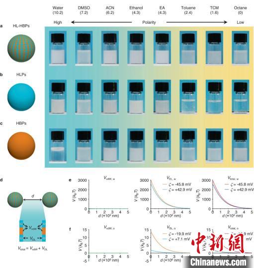 王樹濤指出,研究團隊在之前基礎上進一步研究發現,親水-疏水異質微球表面具有交替的親水、疏水成分,這種結構既有利于高極性溶劑(水)的鋪展,又有利于中等極性溶劑(乙醇等有機溶劑)、低極性溶劑(辛烷等油性有機溶劑)的鋪展。此外,在親水區,很容易引入帶電基團,這些基團能為顆粒間提供靜電排斥作用,從而在不同溶劑中實現良好的分散。