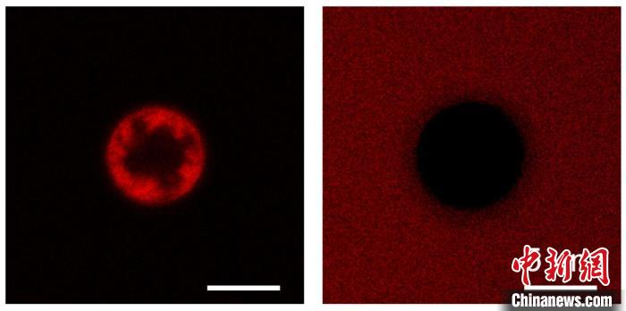 左圖:微球從廢水中捕獲染料的熒光顯微圖像;右圖:微球在有機溶劑中釋放染料的熒光顯微圖像。中國科學院理化所供圖