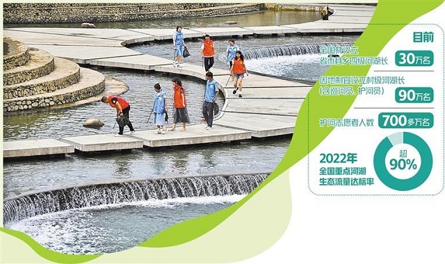 一級抓一級,層層抓落實。數據顯示,目前全國共設立省市縣鄉四級河湖長30萬名,因地制宜設立村級河湖長(含巡河員、護河員)90萬名。通過推進河湖長制進企業、進校園、進社區、進農村,護河志愿者人數達700多萬名,全社會關心參與河湖管理保護的氛圍日益濃厚。