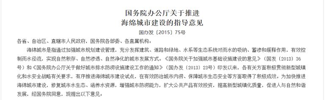 國務院辦公廳2015年10月印發《關于推進海綿城市建設的指導意見》(國辦發﹝2015﹞75號),部署推進海綿城市建設工作。