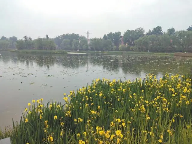 5月10日下午,北京迎來(lái)一場(chǎng)陣雨,記者前往龍?zhí)段骱珗@探訪。雨下得不小,但公園內(nèi)的路面上卻沒(méi)有什么積水,這是因?yàn)椴降冷佋O(shè)的大量透水磚使得雨水可以快速下滲。走近湖邊,一大片盛放的黃色鳶尾花在雨中顯得越發(fā)嬌艷。
