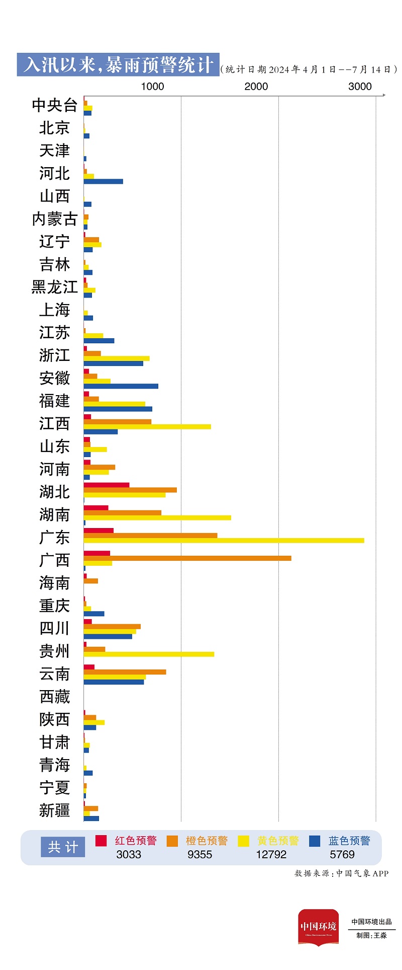 僅在6月份,南方地區(qū)經(jīng)歷了多輪強(qiáng)降雨天氣過程,中央氣象臺(tái)從6月10日開始連續(xù)21天發(fā)布暴雨預(yù)警,其中4天發(fā)布了最高級別的暴雨紅色預(yù)警。全國共發(fā)布紅色預(yù)警信息1969條,其中暴雨紅色預(yù)警信息占全部的45.7%,同比增加61.1%。