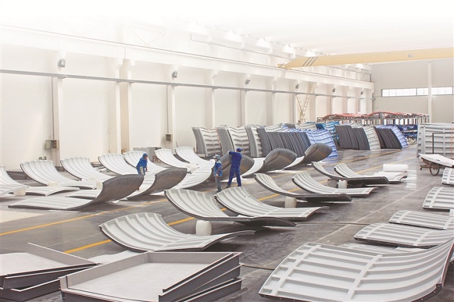 江蘇海鷗冷卻塔股份有限公司的車間內(nèi),工人正在對節(jié)水型冷卻塔風(fēng)筒部件進(jìn)行配對組裝。 江蘇海鷗冷卻塔股份有限公司供圖