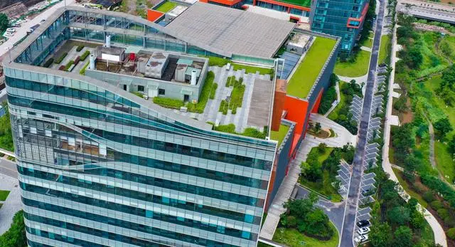 比如,仙桃數據谷中心辦公區利用屋頂空間設置綠色屋頂,并在綠植區域設置具有一定坡度的旱溪、下凹式綠地、階梯式綠地與滲濾溝,通過砂率層截留雨水,延緩徑流高峰的形成,不但能收集周邊路面及屋頂的雨水節能減排,還能實現景觀與建筑的融合,達到提升品質的效果。