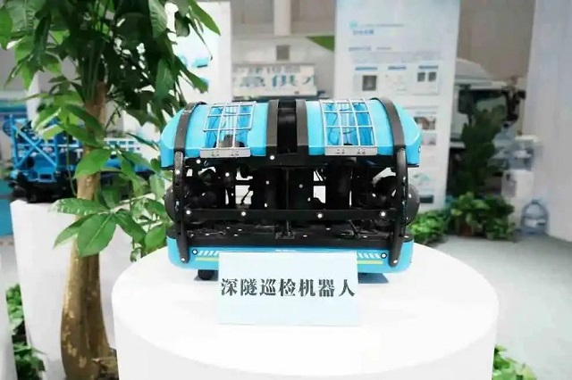 中建三局綠投公司參展的深隧巡檢機器人已應用于武漢大東湖深隧工程,能夠在高水位、多障礙物等復雜環境下,實現準確定向、定位、懸停等操作,最大工作水深100米,最長檢測距離4.5公里,最大抗流能力1.2米每秒,創新集成聲、光、電磁三位一體檢測系統,對隧道內部厘米級厚度淤積和毫米級結構表面損傷進行檢測,檢測精度達90%以上,保障深隧安全穩定運營