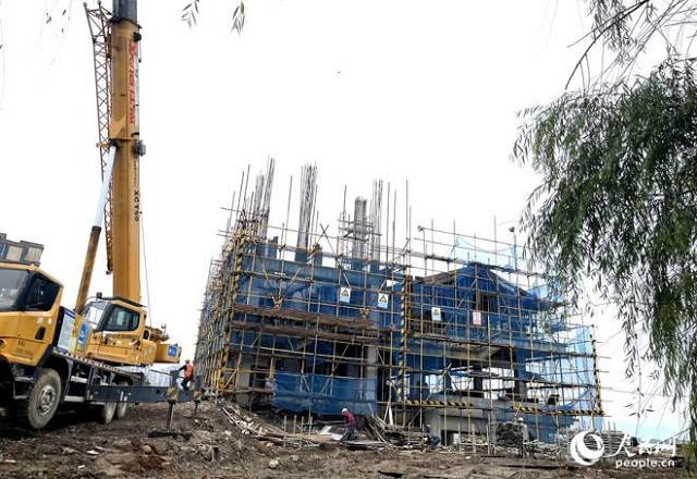 細雨綿綿,工地上一派忙碌景象。人民網記者 陳藍燕攝