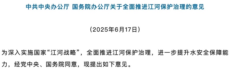 2025年6月17日,《中共中央辦公廳國務院辦公廳關于全面推進江河保護治理的意見》(以下簡稱《意見》)正式發布。