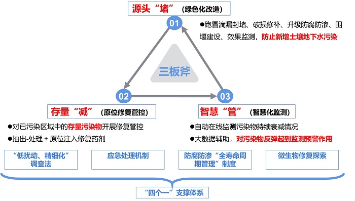 第一板斧是“堵源頭”,主要通過實施封堵跑冒滴漏、修補破損、更換管道、升級防腐防滲、建設圍堰等綠色化改造工程,企業從源頭上消除了土壤和地下水污染風險,防止新增土壤與地下水污染。