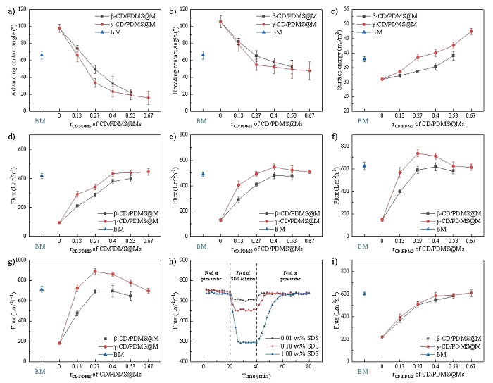 研究成果揭示了CD類型、CD/PDMS摩爾比-CD/PDMS聚輪烷動態性-膜綜合性能間的級聯關系,確定了最佳抗污染層結構。因γ-CD空腔大、柔性強,γ-CD/PDMS聚輪烷的動態性優于β-CD/PDMS聚輪烷。當CD和PDMS鏈節數量比為0.27~0.40時(CD完全覆蓋PDMS時該值為0.67),CD/PDMS聚輪烷動態性最強,此時單個CD動態性和CD數量的乘積最大。實驗結果表明,膜綜合性能在超分子抗污染層動態性最強時達到最高值,20℃下滲透通量500 LMH·bar-1,過濾BSA溶液通量衰減率14.2%,恢復率99.7%,且優秀抗污染效果普適于酵母菌、腐植酸、海藻酸鈉、乳化油等多種污染物,在松花江水、市政污水和魯奇爐煤氣化污水等實際水體的72小時錯流實驗中,也表現出了優越的穩定性,每個反洗周期(4小時)中衰減率僅為3%-7%,化學清洗后通量恢復率接近100%。反證實驗表明了超分子動態性是膜通量提升的關鍵因素,基于AFM的作用力測定和微量吸附實驗進一步證明了超分子動態性在膜抗污染能力強化方面的多重作用。團隊通過實驗和理論的相互驗證,為水處理膜抗污染能力強化提供了更多策略。