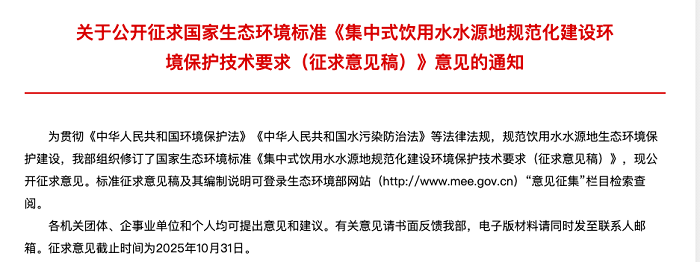 為貫徹《中華人民共和國(guó)環(huán)境保護(hù)法》《中華人民共和國(guó)水污染防治法》,規(guī)范飲用水水源地生態(tài)環(huán)境保護(hù)建設(shè),提升水源水質(zhì)安全保障水平,生態(tài)環(huán)境部日前發(fā)布通知,就《集中式飲用水水源地規(guī)范化建設(shè)環(huán)境保護(hù)技術(shù)要求(征求意見(jiàn)稿)》(以下簡(jiǎn)稱《征求意見(jiàn)稿》)公開(kāi)征求社會(huì)各界意見(jiàn),意見(jiàn)反饋截止日期為2025年10月31日。
