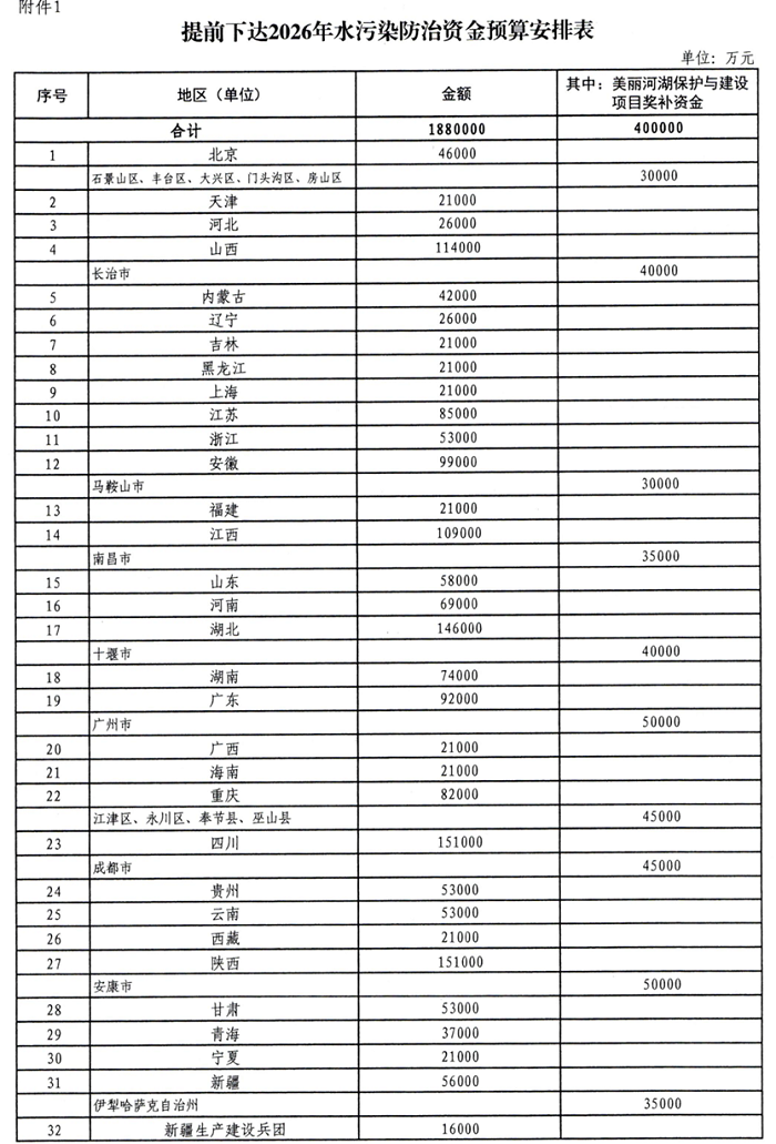 為支持水污染防治工作,促進水環境質量改善,現下達你?。ㄗ灾螀^、直轄市、新疆生產建設兵團,以下統稱省)2026年水污染防治資金,用于支持水污染防治和水生態環境保護方面相關工作,并就有關事項通知如下: