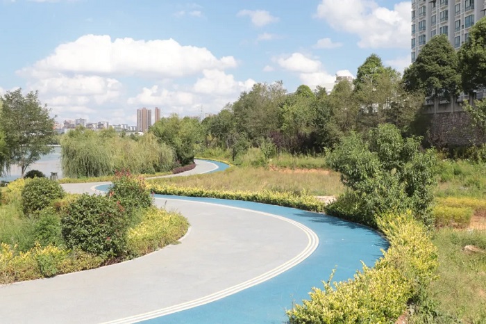 位于安順經(jīng)開區(qū)的花山綠道,總長約2.4公里,保留原162鐵路原始風貌,沿線設置三線文化廣場、休息椅等設施,同時鋪設透水路面、建設植草溝,既串聯(lián)起休閑健身與文化體驗功能,又能有效滯留雨水。老城環(huán)路虹山湖路段則打造了下沉式綠地、觀景平臺,夜晚燈光亮起時,成為市民休憩打卡的熱門地點。市政道路與背街小巷的海綿化改造也同步推進,通過鋪設透水路面、打造下凹式綠化帶等方式,讓雨水“落地即滲”。